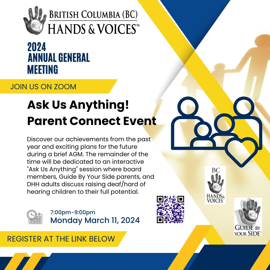 WHAT: Join us at our Annual General Meeting as we share our achievements over the past year and learn about exciting plans ahead. We’ll start with a short AGM and then use the rest of our time for our “Ask Us Anything” event, Join Board Members, Guide By Your Side parents and DHH adults as we discuss a variety of topics related to raising well-adjusted deaf/hard of hearing children who can reach their full potential!