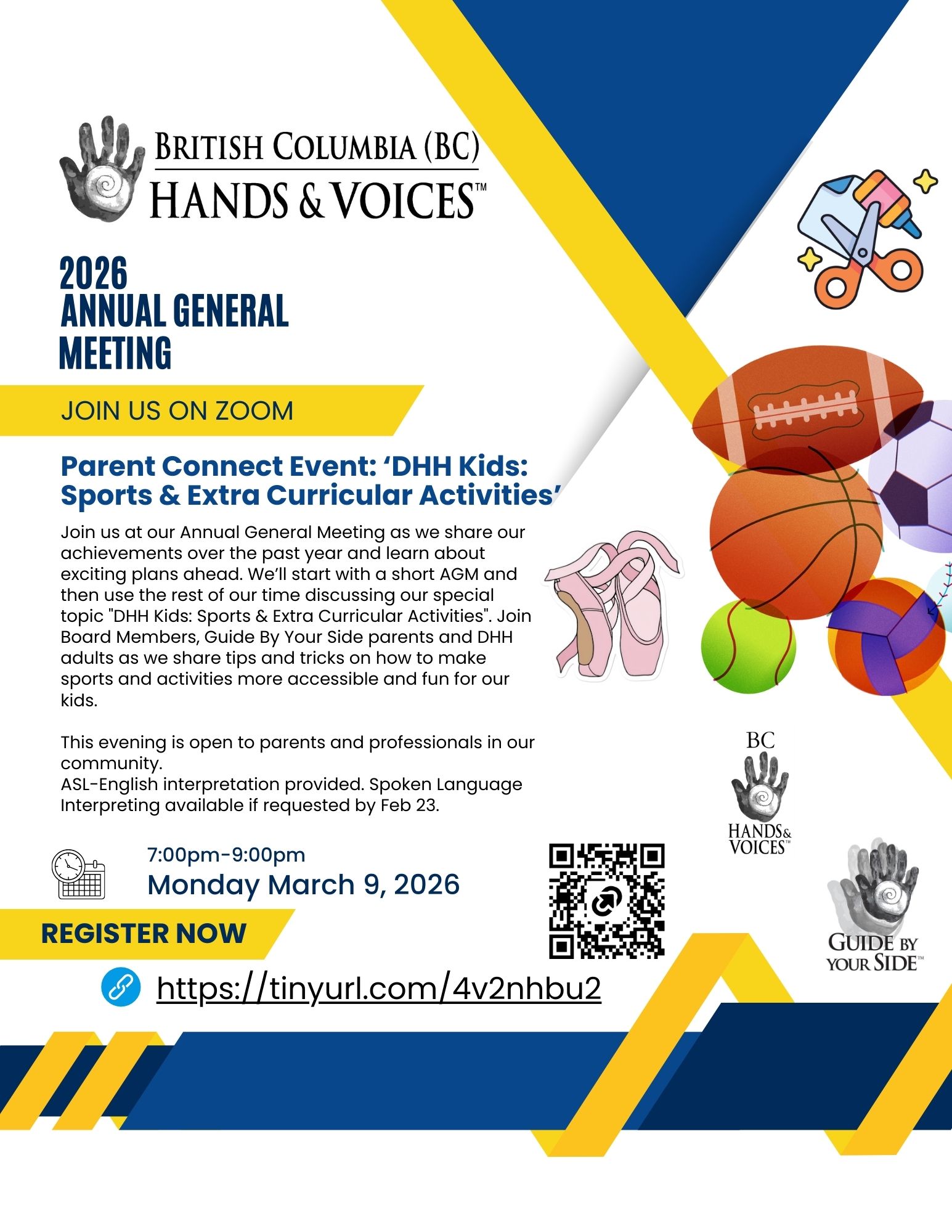 WHAT: Join us at our Annual General Meeting as we share our achievements over the past year and learn about exciting plans ahead. We’ll start with a short AGM and then use the rest of our time discussing our special topic “DHH Kids: Sports & Extra Curricular Activities”. Join Board Members, Guide By Your Side parents and DHH adults as we share tips and tricks on how to make sports and activities more accessible and fun for our kids. This evening is open to parents and professionals in our community.