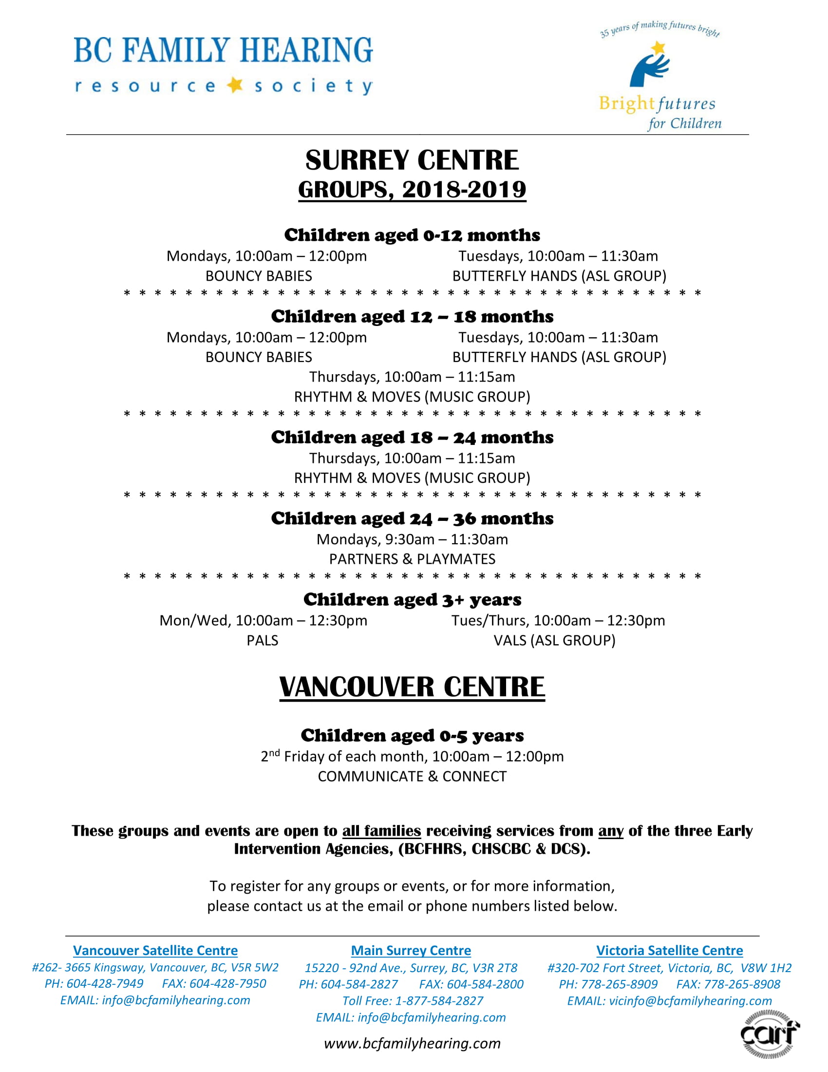 BC Family Hearing Resource Society is hosting many groups next fall! These groups and events are open to all families receiving services from any of the three Early Intervention Agencies, (BCFHRS, CHSCBC & DCS). Check the PDF and be sure to register with your closest centre.