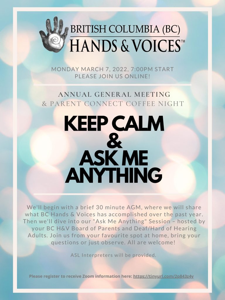 We’ll begin with a brief 30 minute AGM, where we will share what BC Hands & Voices has accomplished over the past year. Then we’ll dive into our “Ask Me Anything” Session – hosted by your BC H&V Board of Parents and Deaf/Hard of Hearing Adults. Join us from your favourite spot at home, bring your questions or just observe. All are welcome!