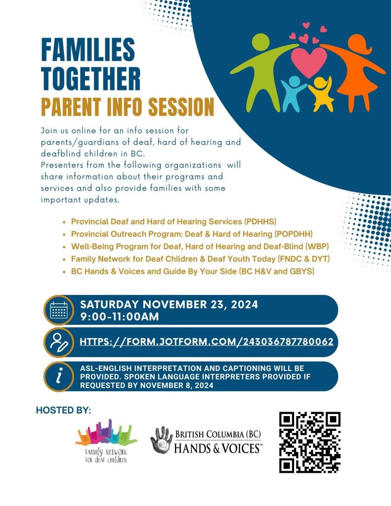 WHAT: Join us online for an info session for parents/guardians of deaf, hard of hearing and deafblind children in BC. Presenters from the following organizations will share information about their programs and services and also provide families with some important updates.