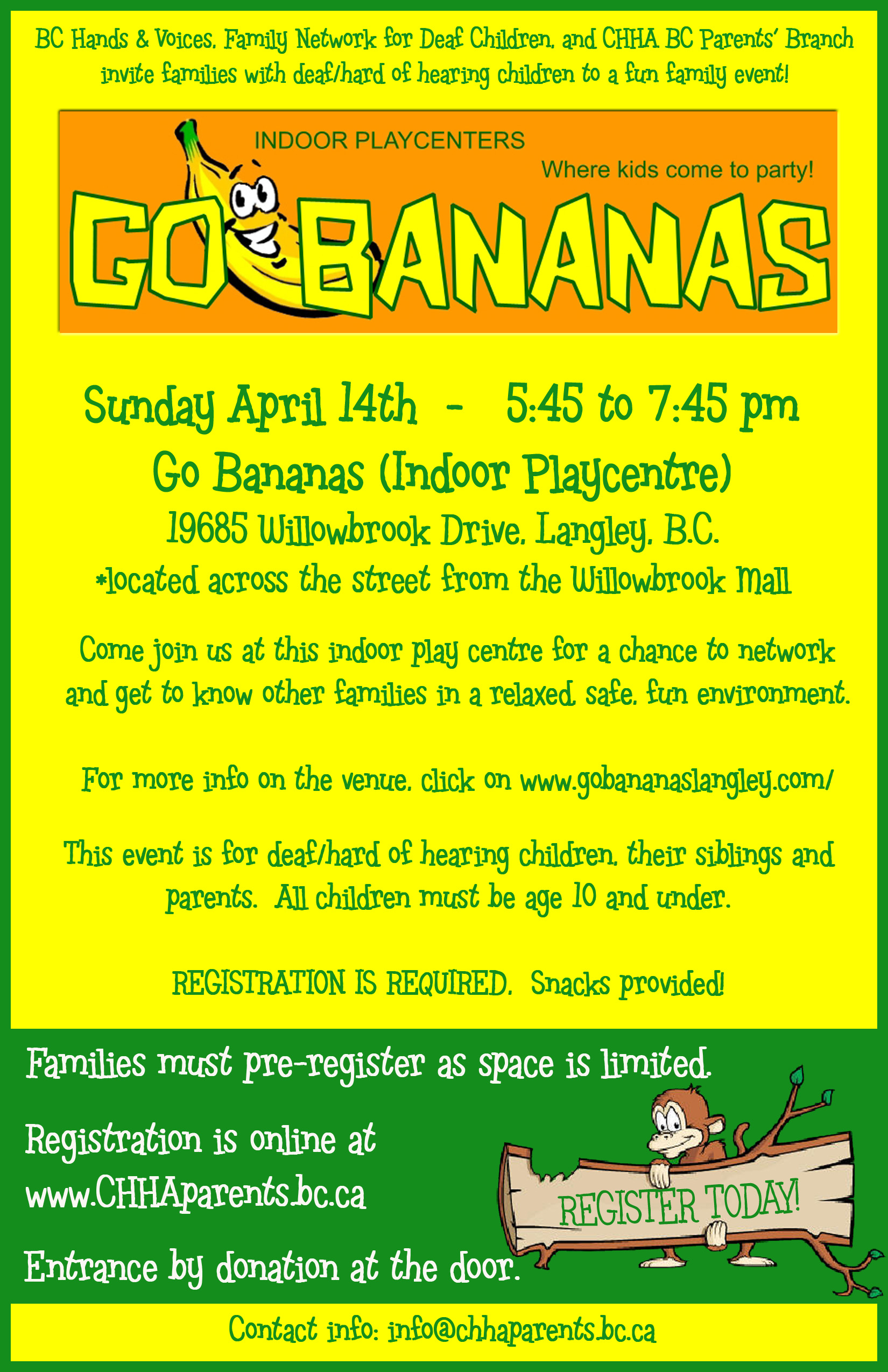 BC Hands & Voices, Family Network for Deaf Children, and CHHA BC Parents’ Branch invite families with deaf/hard of hearing children to a fun family event!
