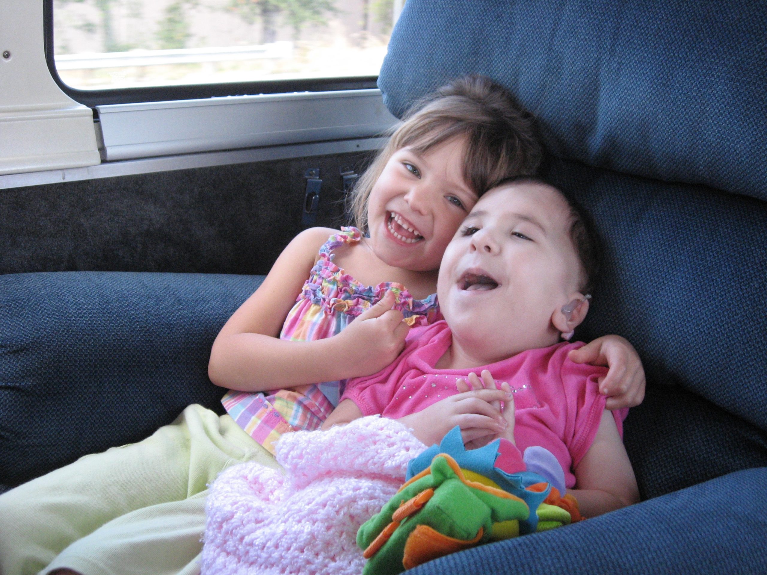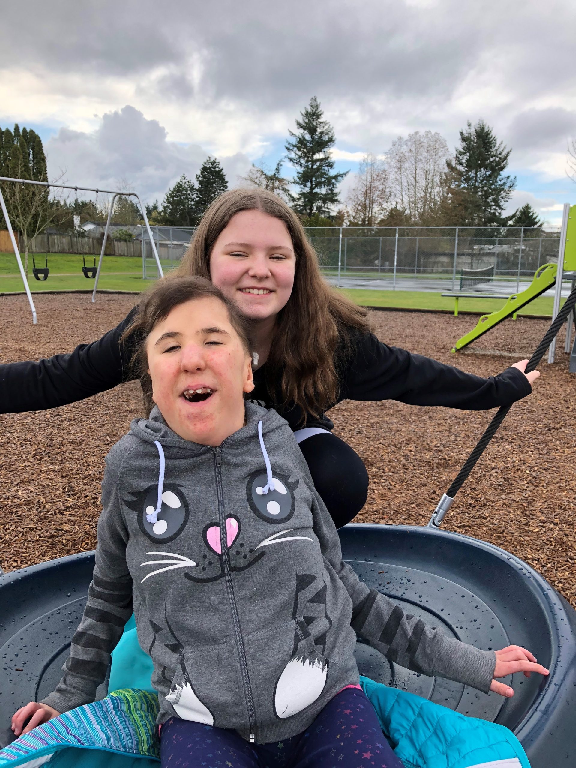 AS – When we were little, I loved to play school with her. We made forts (I was an expert fort maker). I taught her how to crawl and would clean the bedroom for us when we shared a room. Later on, we had a swing set and would swing beside each other and I would push her – she had an adaptive swing. When we got a trampoline, she would love laying on it while I bounced her – and she still does! She gives me the biggest smiles and hugs. When I would wake up at night, I would go in her room and wake her up and say hi. She would just go back to sleep and I don’t think you ever heard me on the monitor!