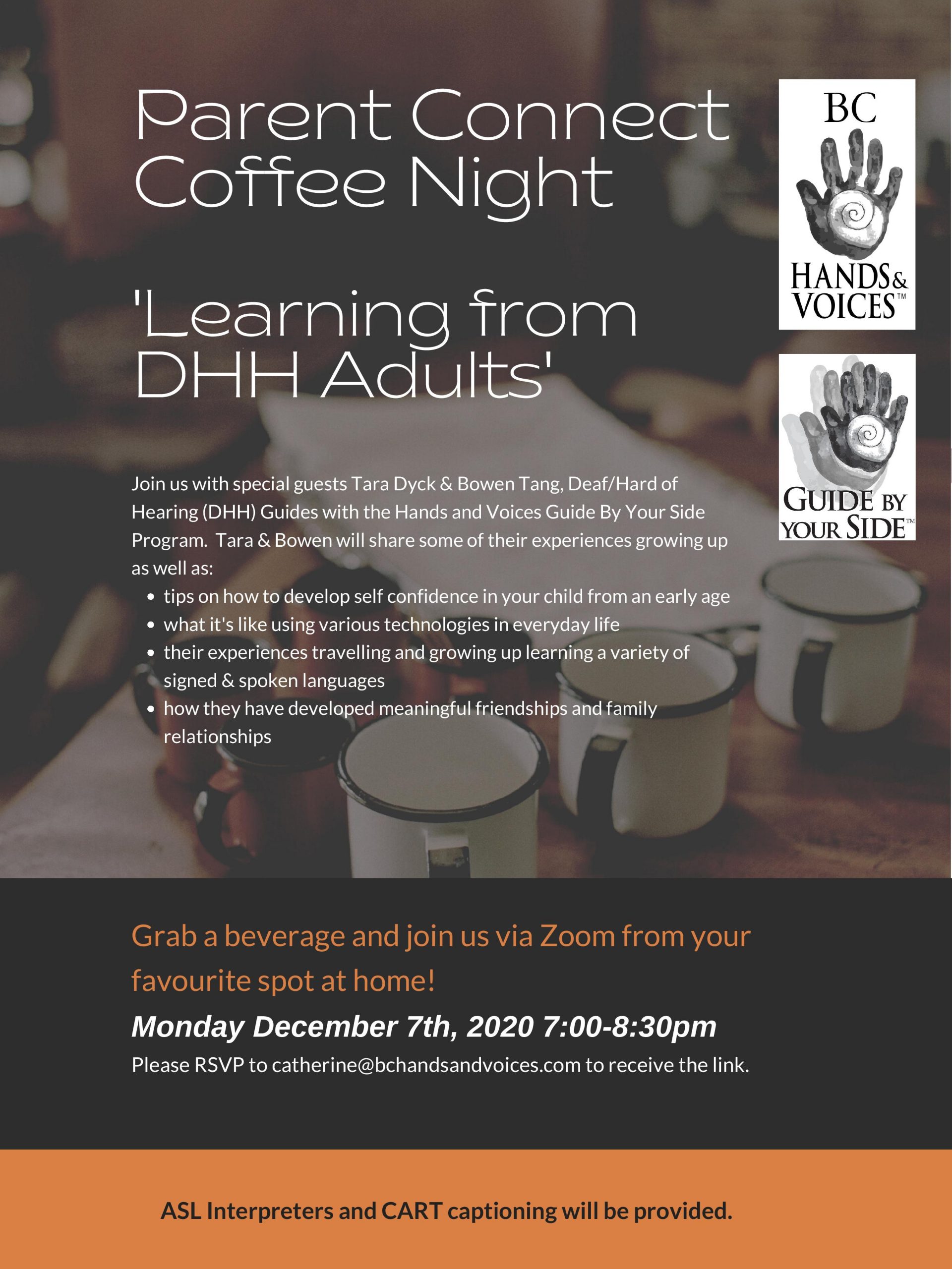 Join us with special guests Tara Dyck & Bowen Tang, Deaf/Hard of Hearing (DHH) Guides with the Hands and Voices Guide By Your Side Program. Tara & Bowen will share some of their experiences growing up as well as: