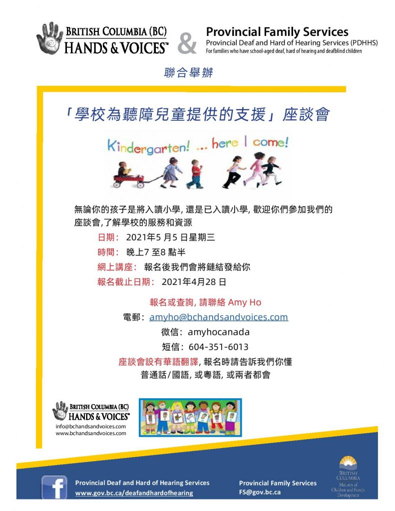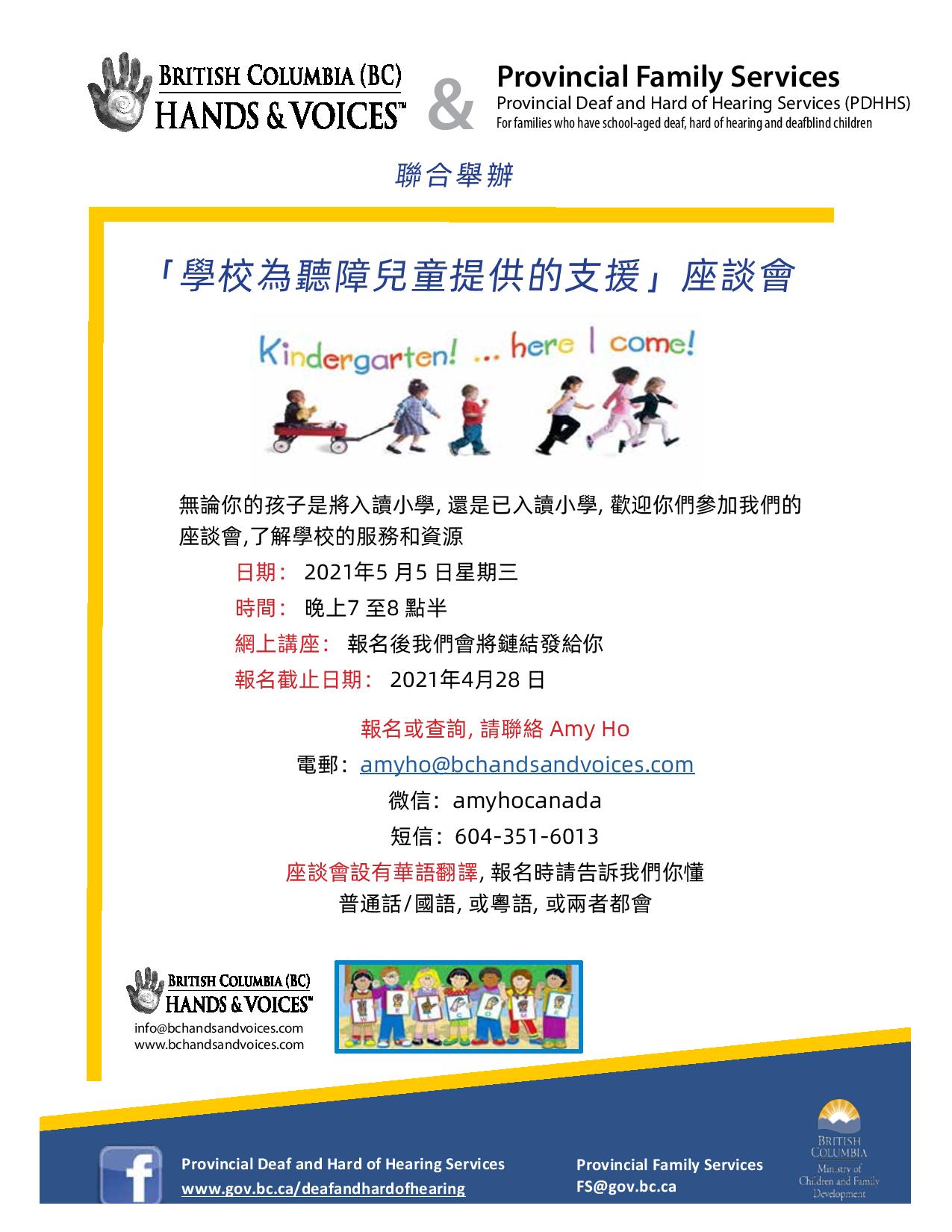 BC Hands & Voices & Provincial Deaf and Hard of Hearing Services present “School Transition Information Night” for Chinese Speaking Families Wednesday May 5, 2021 7:00-8:30pm.