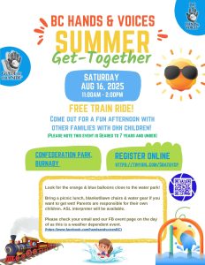WHAT: Come out for a fun afternoon with other families with dhh children! (Please note this event is geared to 7 years and under) Look for the orange & blue balloons! (Parking lot closest to splash pad is at Beta Ave & Dundas Street.)