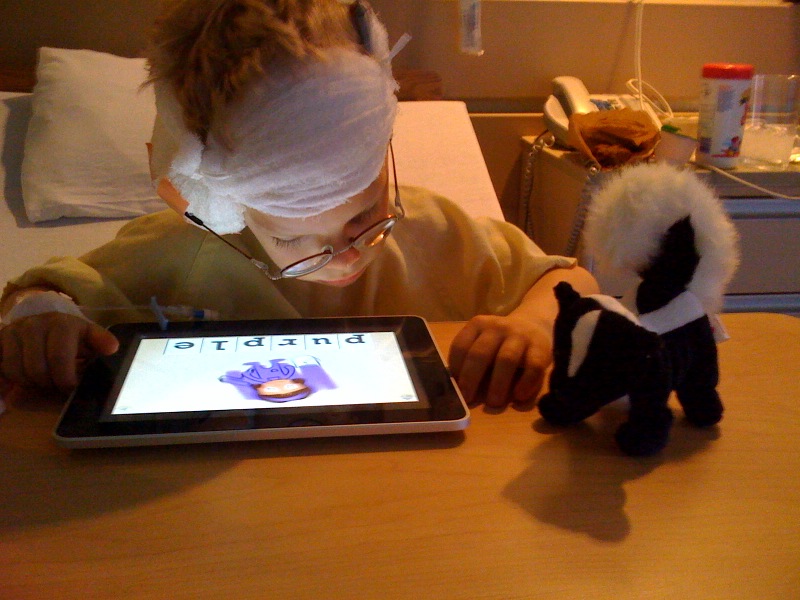 When Scott awoke from his second cochlear implant surgery, and had had a bit of time to figure out where he was, we handed him an iPad. He had been a brave little guy, and we had wanted to get him one since the product was announced. He was so happy he could watch a movie in his hospital bed, and his favourite spelling games he knew from the iPhone were so much easier to see on the bigger screen. His iPad is a valuable tool to help him learn at school, and a great comfort at the end of a busy day to curl up in a chair and look at family photos.